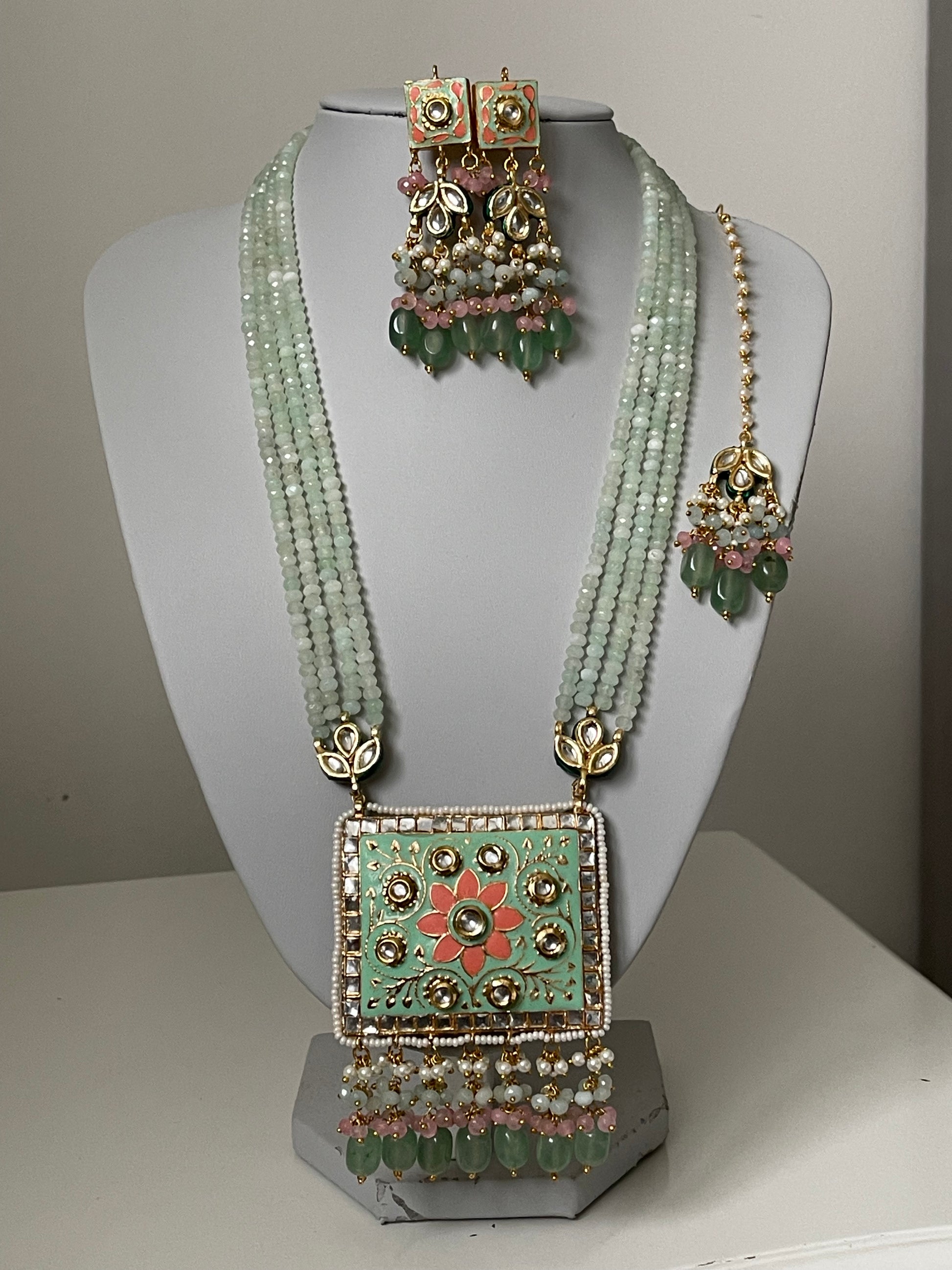 Mint statement Meenakari Kundan Mala/ long haar set with earrings and tikka (headpiece)